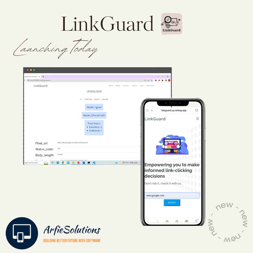 LinkGuard is a powerful web application designed to detect whether a given URL is suspicious or not. It is equipped with two advanced trained models, namely logistic regression and random forest, which analyze the URL and provide an accurate assessment of its authenticity. In addition to these models, LinkGuard also verifies the URL through the VirusTotal API, ensuring that the URL has not been flagged as suspicious by any other antivirus engines.